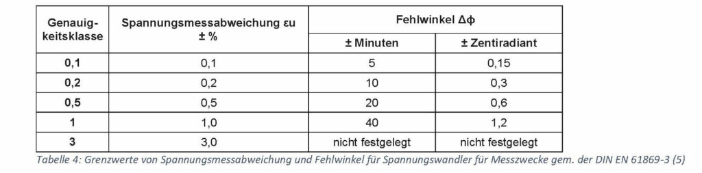 The secondary signal of the voltage transformer can also have a phase error. The following table shows the measurement classes of DIN EN 61869-3.
